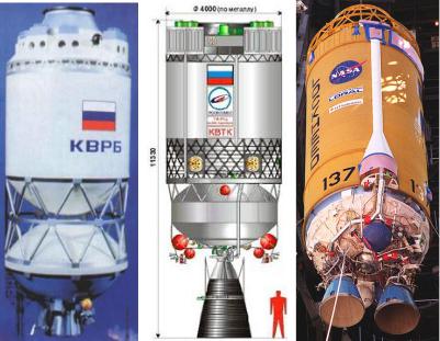 Компоненты топлива в этих блоках - жидкий кислород и жидкий водород. Блок «КВРБ» планировался для РН типа «Протон» и представлен на рис. 16.9 слева. Он разработан и изготовлен в ГКНПЦ им. М.В.Хруничева для индийской РН GSLV под индексом «12КРБ» [98]. В составе ракеты GSLV этот блок обеспечивает выведение на геопереходную орбиту КА массой до 2,5 тонн с индийского космодрома Шрихарикота-Шар. Начальная масса блока – 15,1 т, масса топлива - 12,6 т, сила тяги двигателя - 73,5 kH. Маршевый двигатель КВД1 разработан конструкторским бюро химического машиностроения им. А.М.Исаева [99].