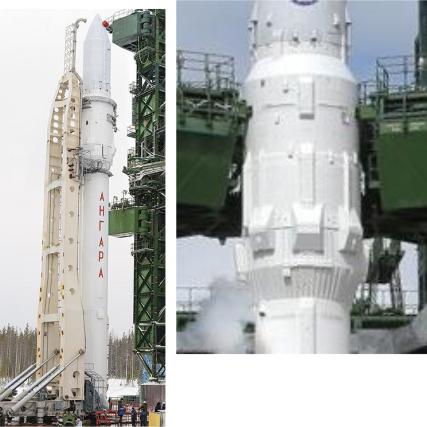 На рис. 17.3 показан пакет ракетных блоков РН тяжёлого класса «Ангара-5.1Л» в монтажно-испытательном корпусе [102]. Первый пуск ракеты с разгонным блоком «Бриз-М» был осуществлён 23 декабря 2014 года с космодрома «Плесецк» (рис. 17.4).