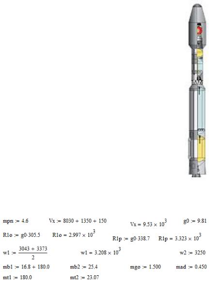 R1pсила тяги ракетного двигателя РБ второй ступени в пустоте; w1 и w2 –удельные импульсы двигателей соответствующих РБ; mb1 – масса ракетного блока первой ступени;