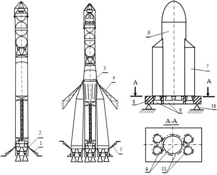 Если ракета опирается на хвостовые отсеки центрального и боковых блоков одновременно, то должно быть предусмотрено специальное устройство, например стартово-стыковочное (см. схему на рис. 18.9, в). Оно должно иметь окна для газовых струй, регулируемые опоры для установки этого устройства на СК, элементы крепления РН, электропневмогидроразъёмы, элементы проверочного оборудования и др. Стартово-стыковочное устройство может транспортироваться и устанавливаться на стартовый стол отдельно от РН или совместно с РН. В последнем случае РН стыкуется со стартовостыковочным устройством в монтажно-испытательном корпусе и транспортируется совместно с РН.