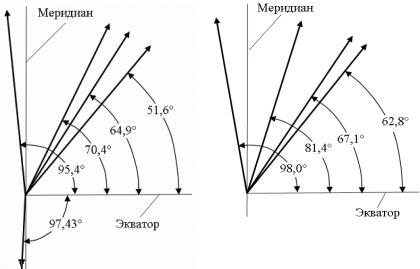 Рис. 18.13. Углы наклонения плоскостей орбит КА для космодромов Байконур (слева) и Плесецк (справа)