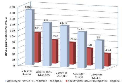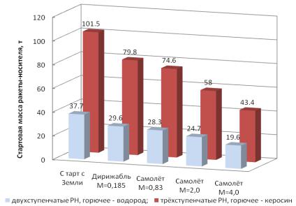 Анализ результатов показывает, что чем больше скорость и высота полёта дирижабля или самолёта, тем меньшая масса РН требуется для вывода фиксированной полезной нагрузки. Наиболее эффективным в весовом отношении является старт с гиперзвукового самолета при М=4 с компонентами топлива «жидкий водород - жидкий кислород».