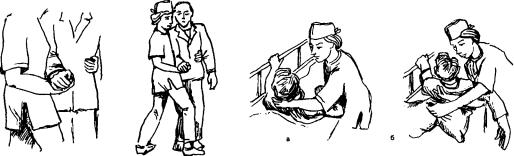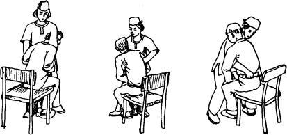 . Наклониться слегка вперед за спиной пациента и крепко охватить его за локти, |