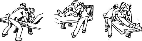 9. Выпрямить ногу, расположенную у ног пациента, и перенося массу своего тела на другую ногу, расположенную ближе к изголовью, приподнять пациента. Локоть, обеспечивающий у п о р , разогнуть.