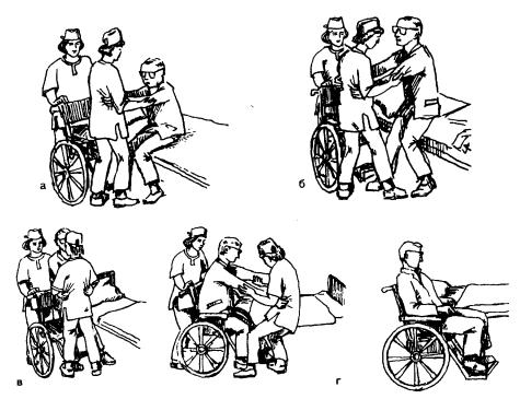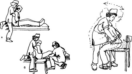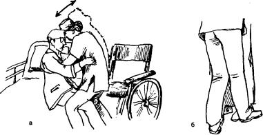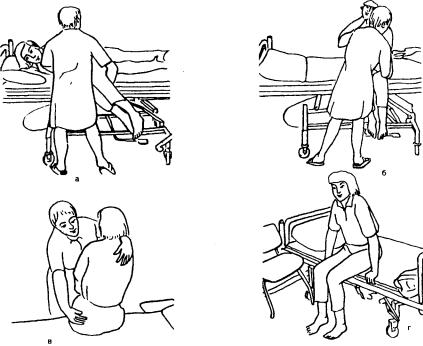 мещает его ноги к краю кровати, в то время как другая с е с т р а поднимает е г о ту ловище и, сгибая с в о и колени, опускает пациента на стул.