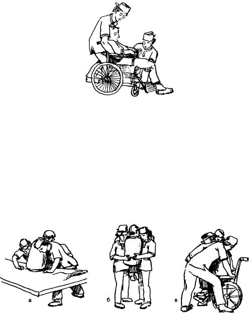 П е р е м е щ е н и е п а ц и е н т а с к р о в а т и н а с т у л ( к р е с л о - к а т а л к у ) ( в ы п о л н я ю т д в а и л и б о л е е ч е л о в е к м е т о д о м « п о д н я т и е п л е ч о м » ; п а ц и е н т м о ж е т с и д е т ь , н о с а м о с т о я т е л ь н о н е п е р е д в и г а е т с я ) ( р и с . 2 . 3 1 )