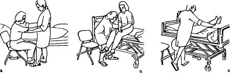 до «трех», раскачивайтесь . На счет «три» поставить пациента, затем поворачивать ся с ним, нога к ноге, пока он б е д р а м и не коснется края кровати.