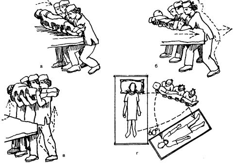 •сестра, у д е р ж и в а ю щ а я голову, плечи и спину пациента, — менее широкие, разворачиваясь лицом к каталке.