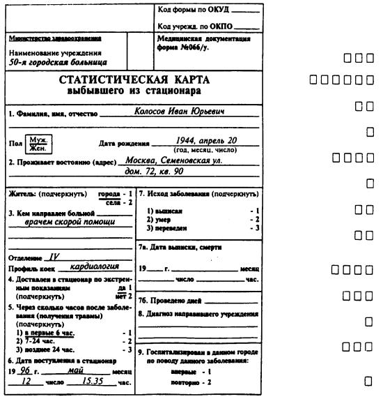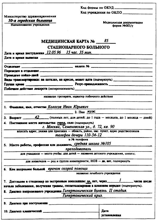 отчество пациента, год рождения, данные страхового полиса, домашний адрес, откуда и кем доставлен, диагноз направившего учреждения (поликлиника, «скорая помощь»), диагноз п р и е м н о г о отделения, а также в какое отделение направлен.