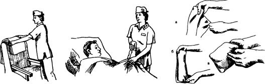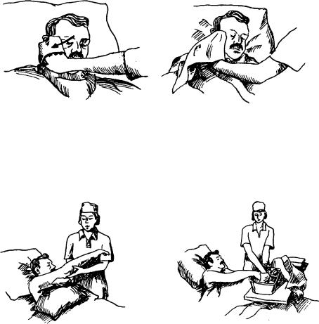 12. Вымыть, ополоснуть и вытереть кисть пациента, если возможно, опустить ее в емкость с в о д о й : положить клеенку (впитывающую пеленку) на постель, пос тавить емкость с в о д о й и опустить кисть (рис. 3.11). Убрать полотенце из - под руки пациента . Укрыть руку п р о с т ы н е й .