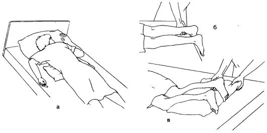 13. Слегка согнуть оба колена пациента и подложить подушку (от колен до лодыжек). 14. С п о м о щ ь ю высокой подушки приподнять пальцы стоп на матраце, чтобы