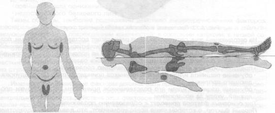 ослабленных пациентов в п о л о ж е н и и «на спине» (крестец, область лопаток, лок тей, пяток, затылка). В положении «на боку» пролежни могут образовываться в области