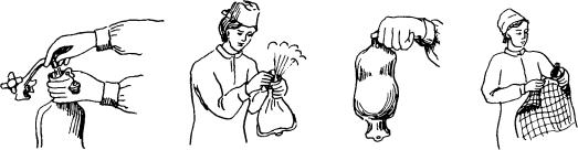 Рис. 6.6. Подготовка пузыря к применению (а—в) и его постановка (г)