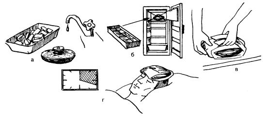Холод (пузырь со льдом) сужает кровеносные сосуды кожи глубоко располо женных органов и тканей, снижает чувствительность нервных рецепторов . Пузырь со льдом применяют при кровотечениях, острых воспалительных процессах в брюшной полости, у ш и б а х (в первые сутки), сильной лихорадке, в послеоперационный пе риод . На рисунке 6.6 показано приготовление и применение пузыря со льдом .