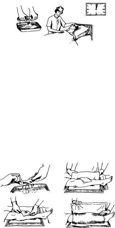 10. Через 1,5—2 ч после наложения компресса пальцем, не снимая повязки, про верить степень влажности салфетки. Если салфетка влажная, укрепить компресс бинтом.
