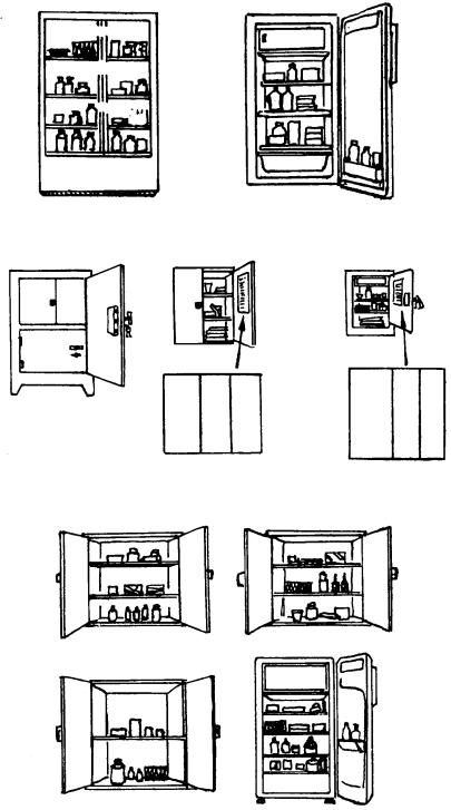 Прежде всего следует разделить лекарственные средства в зависимости от спосо ба введения. Все стерильные растворы в ампулах и флаконах (на флаконах с препара тами, изготовленными в аптеке, должна быть голубая этикетка) хранят в процедурном кабинете в стеклянном шкафу. На одной из полок располагают антибиотики и их рас творители, на другой (нижней) — флаконы для капельного вливания жидкостей вмести тельностью 200 и 500 мл, на остальных полках — коробки с ампулами, не входящими в список А (ядовитые) или Б (сильнодействующие), т. е. растворы витаминов, дибазола, папаверина, магния сульфата и др . В холодильнике при определенной температуре (от +2 до + 1 0 °С) хранятся вакцины, сыворотки, инсулин, белковые препараты (рис. 9.1).