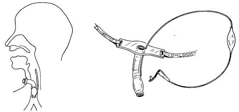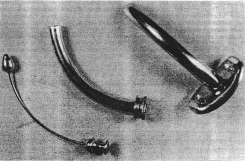 Если трубка случайно выскочила, сразу же вводят расширитель трахеи и раз водят б р а н ш и , чтобы удерживать трахею открытой. Пациенту нужно сказать, что ему ничего не угрожает и попросить лежать спокойно, так как беспокойные движения могут вызвать о д ы ш к у и усилят тревогу .