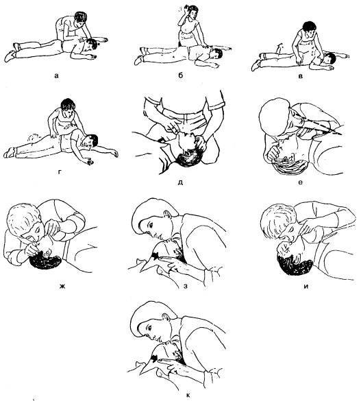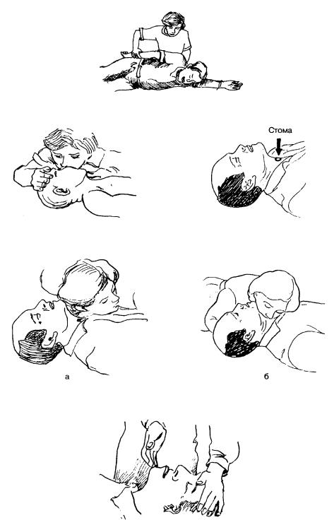 вая в о з м о ж н о с т ь ИВЛ методом «рот в рот». Если протезы выпали, то запрокиды вание головы и поднятие подбородка помогут поставить их на место. Убирать протезы нужно только в том случае, если о н и выпали и их не удается поставить на место, или о н и перекрывают дыхательные пути и создают трудности для проведения ИВЛ .