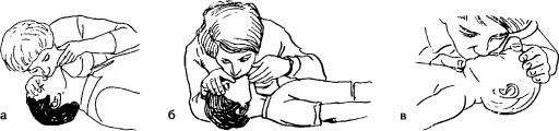 Рис. 15.10. Положение головы при ИВЛ: а — взрослого; б — ребенка; в — младенца