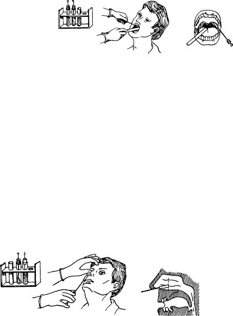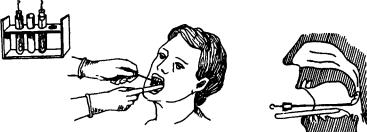 5. Не касаясь тампоном слизистой оболочки полости рта и языка, провести там поном по дужкам и небным миндалинам (при подозрении на дифтерию — на границе измененной и неизмененной ткани миндалин).