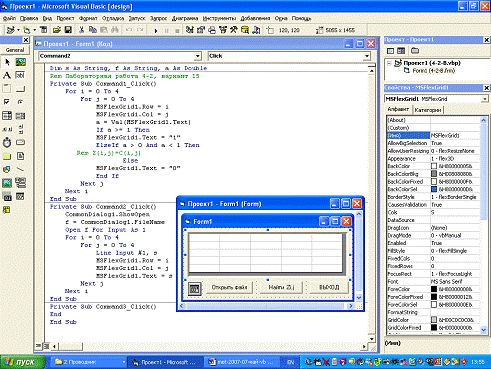 Нажать кнопку «Открыть файл» и открыть файл с исходными данными Ci,j. После этого нажать кнопку «Найти Zi,j». В окне MSFlexGrid1 появилась таблица значений Zi,j. Для завершения работы приложения следует