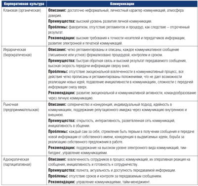 Основные характеристики коммуникаций в зависимости от типа корпоративной культуры