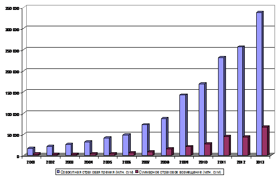 Статистика основных макроэкономических показателей страхового рынка за 2001-2013 показывает, что с 2008 года наблюдается резкий рост в поступлении страховых премий. Это обусловлено введением в 2008-2009 годах обязательного страхования гражданской ответственности владельцев транспортных средств (ОСАГО) и обязательного страхования ответственности работодателя. Например, согласно данным Страхнадзора, объем поступлений страховых премий по этим обязательным видам страхования составили 62.9 млрд. сум и 25.2 млрд. сумм, то вместе составляют 26% поступивших суммарных страховых премий.