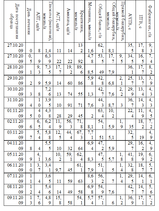 В частности, в процессе лечения сепсиса ежедневно делается общий и биохимический анализы крови. На основе результатов анализов рассчитывается корреляционная матрица с помощью компьютерной программы Microsoft Excel, в которой обращают внимание на высокие коэффициенты корреляции. На основании высоких коэффициентов корреляции строятся графики, характеризующие взаимосвязь между показателями крови, и проводится анализ полученных взаимосвязей.