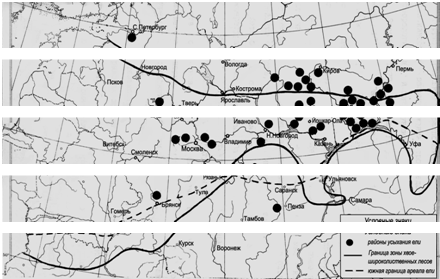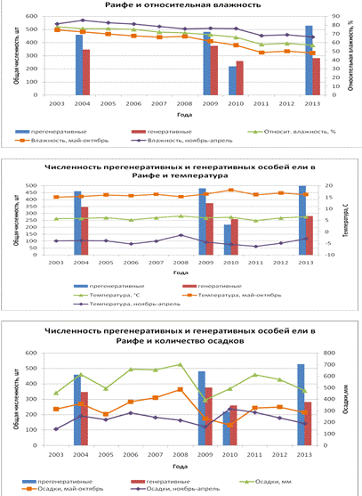 Для изучения состава и структуры хвойно-широколиственных сообществ и их динамики под влиянием различных экологических фактров использовался популяционный метод. Для этого изучалась популяционная организация одного из основных древесных эдификаторов ─ Picea fennica (Regal) Kom. Изучение динамики популяционной структуры ели финской за 10-летний период, под воздействием различных природных явлений (морозной зимы 2005-2006 г., урагана 2007 г., летней засухи 2010 г., эпифитопии 2011-2013 гг.) позволит оценить ее состяние на территории Раифского участка ВКГПБЗ.