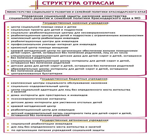 Благодаря отлаженной структуре отрасли социальной защиты населения (представленной на рисунке 2.1) Краснодарский край - один из крупнейших регионов России по числу граждан, которым предоставляются меры социальной поддержки, предусмотренные федеральным и краевым законодательством.