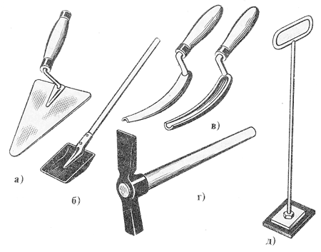 Высокопроизводительный труд каменщика и высокие качества каменной кладки возможны, если каменщик обеспечен специальным инструментом и приспособлениями.