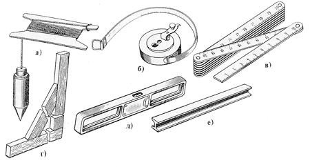 Отвесы (рис.2а) (ГОСТ 7948-80) служат для проверки вертикальности стен, простенков, столбов и углов кладки. Отвесами массой 200…400 г проверяют кладку по ярусам и в пределах высоты этажа, 600…1000 г - наружных углов здания в пределах высоты нескольких этажей.