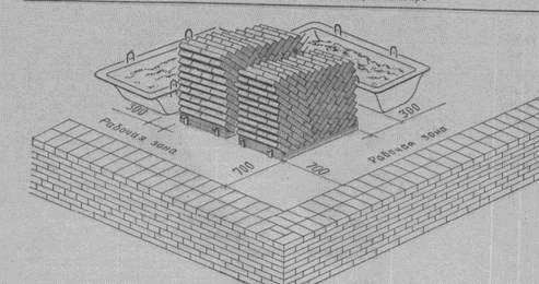 Участок кладки вместе с установленными рядом поддонами с кирпичом, ящиками раствора и подмостями образует рабочее место каменщика. При кладке глухих участков стен рабочее место каменщика имеет ширину 2,5...2,6 м и подразделяется на зоны:
