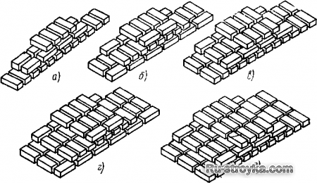 В стенах толщиной 1/2 и 2/2 кирпича (рис. 4, б, г) наружную версту первого ряда укладывают тычками, а внутреннюю - ложками; забутку выполняют всегда тычками.