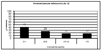 Совершение от 10 до 15 ошибок и более в тесте говорит о очень низкой способности к смене деятельности, низкой переключаемости внимания, низкой лабильности мыслительных процессов. В данной выборке 17% учеников допустили от 10 до 14 ошибок, и более 15 ошибок сделали 17% испытуемых. Таким образом, можно сделать предварительный вывод что, так как цель исследования - изучение особенностей мышления подростков, то можно сказать, что только 66% испытуемых обладают достаточными способностями к обучению, к логическому мышлению, обладают необходимыми математическими, лингвистическими и техническими способностями.