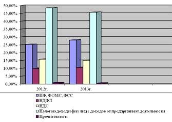 Далее необходимо обратиться к таблице 5, чтобы определить какие налоги имеют наибольший удельный вес в общей сумме налоговых платежей предприятия. Таковыми являются налоги в ПФ, ФОМС, ФСС (25,2% в 2012 г. и 28,0% в 2013 г.), а также налоги на доходы физических лиц с доходов от предпринимательской деятельности (соответственно 48,5% и 45,7%) и НДС (15,8% и 15,1%).