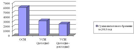 Рисунок 3 - Сумма налогового бремени ИП Тетерский А.А. за 2013 год при применении различных налоговых режимов, тыс. руб.