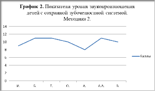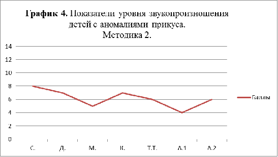 Поводя итоги обследования звукопроизношения с помощью второй методики, мы видим, что средние показатели в экспериментальный группе детей с аномалиями прикуса варьируются от 5 до 8 баллов (график 4).