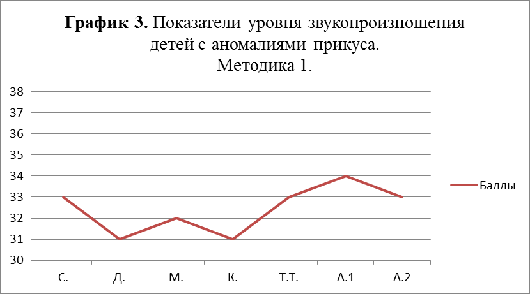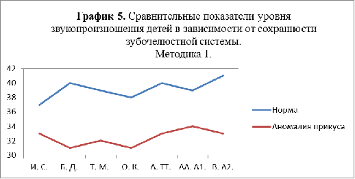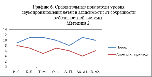 Исследование показало, что средние показатели обследования звукопроизношения у детей экспериментальной группы с аномалиями прикуса по первой методике дают баллы от 31 до 34, входя в промежуток, указывающий на средний уровень звукопроизношения по данной методике, что гораздо ниже показателей сверстников без аномалий.