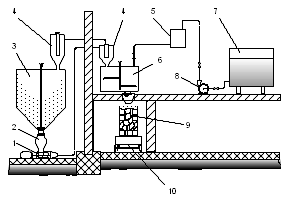 4 устройством подачи 1 доставляется в бетономешалку 6. Туда же из емкости