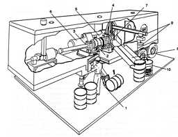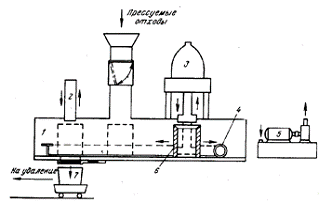 основной пресс, 7 - механизм загрузки/выгрузки, 8 - станция выгрузки, 9 - разгрузочный