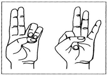 Получилось? А теперь сделай то же самое, не глядя на рисунок. А теперь пальчики на правой руке сложи так, как на рисунке 1, а пальчики левой руки сложи так, как показано на рисунке 2.