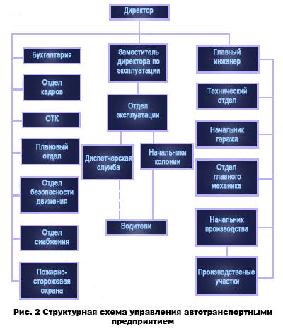 В стандартной организационной системе управления автотранспортным предприятием можно выделить три самостоятельных блока управления: эксплуатационный, технический и экономический, каждый из которых подчиняется соответствующему руководителю.