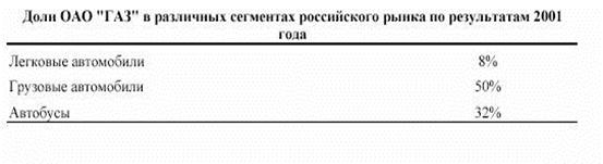 Рис. 6. Доли ОАО «ГАЗ» в различных сегментах российского рынка по результатам 2001 года