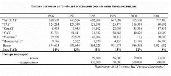 Особенно это касается "Автоваза", который постепенно уменьшает выпуск "дешевых" моделей, расчищая нишу для отечественных производителей ("ИЖавто") и для иностранных конкурентов, в первую очередь корейских компаний. Ставка на "Шевроле Нива", казалось бы, себя оправдала: за 2004 год объем производства вырос на 1,2%. Но по итогам первого квартала 2005 года Волжский автозавод снизил объемы производства, по сравнению с тем же периодом 2004 года, на 4,7 процента. Все же "Автоваз" несомненный лидер в производстве легковых автомобилей от 70 - 75 % всех произведенных ежегодно. Объем реализации продукции в 2004 году составил 3,9 млрд $, для сравнения у "ГАЗа" - 1,1 млрд $. Государство проводит активную протекционистскую политику по отношению к автопрому. Благодаря высоким пошлинам на иномарки и стабильному росту спроса на внутреннем рынке, "Автоваз" ежегодно испытывает рост.