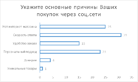 Согласно опросу, наиболее частой причиной покупки товара в социальных сетях является высокая скорость ответа, ожидаемая пользователем при отправке запроса о покупке. Вторым по значимости фактором оказалось отсутствие возможности купить товар в интернет-магазине и третьим, персональный подход к решению задачи потребителя.