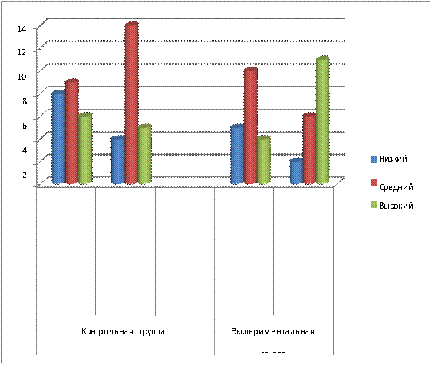 В экспериментальном классе существенно возросло число детей с высоким уровнем. В тоже время в контрольном классе к концу эксперимента этот показатель оказался чуть ниже, по сравнению с началом года. Детей со средним уровнем развития практических навыков в экспериментальной группе стало больше, за счёт уменьшения доли числа детей, имеющих показатель низкий уровень развития. В тоже время в контрольном классе ситуация иная, детей со средним уровнем не просто стало существенно меньше, часть из них попала в категорию низкий уровень развития практических умений. Мы считаем, что это, прежде всего, связано с усложнением диагностических заданий. Если в начале эксперимента были выбраны для изготовления базовые простые формы и простые поделки, то к концу эксперимента поделка, а также базовая форма, лежащая в основе модулей, оказалась сложнее по исполнению. И дети, не имевшие соответствующей тренировки, без оттачивания необходимых приёмов, справились со своей задачей частично.