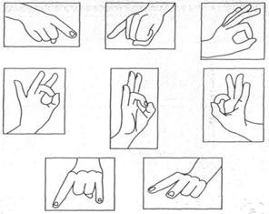 ножками. Толстая ножка гриба - вертикально поднятые пальцы, сложенные щепоткой;