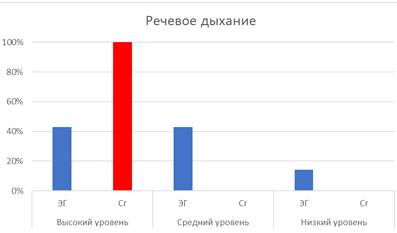 Результаты изучения речевого дыхания детей с нарушениями слуха (ЭГ) и без нарушения слуховой функции (СГ) (%).