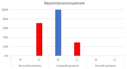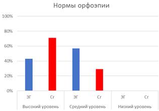В ЭГ 43% детей выполнили задание самостоятельно, что соответствует высокому уровню, испытуемыми соблюдались нормы орфоэпии. 57% дошкольников находятся на среднем уровне, они выполнили задания с помощью педагога, соблюдали орфоэпические нормы только в знакомых словах: оглушение звонких согласных - зуб, глаз, поезд, нож; произнесение безударного О - вода, корова, молоко.